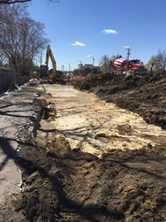 With reaming on the 1,400' drill complete the pullback was scheduled and executed without interruption. The reaming operation was somewhat tedious due to heavy clay and frequent clogging of the reamer. The two 700' strings were joined and the pull back continued. Construction traffic entering and leaving the site had to exercise extreme caution due to the volume of traffic and frequent lane closures and realignments carried out by the highway construction that was ongoing during our project.