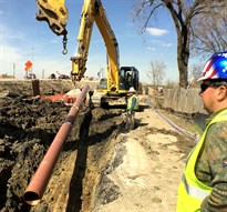 After completing the tie-in the project continued with the removal of the deep shoring systems, sand padding around the pipe, then backfill with flowable fill material and restoration work. All the while traffic control was still in place and surface water was managed and routed to filter bags before discharge back to ground water. One other aspect of the project was the removal of the old pipe which was originally placed at a depth of cover of 50 inches. The sections that could not be removed were plated, grouted and abandoned in place. The following photos tell the story and show some of the steps required to complete a project like this one.