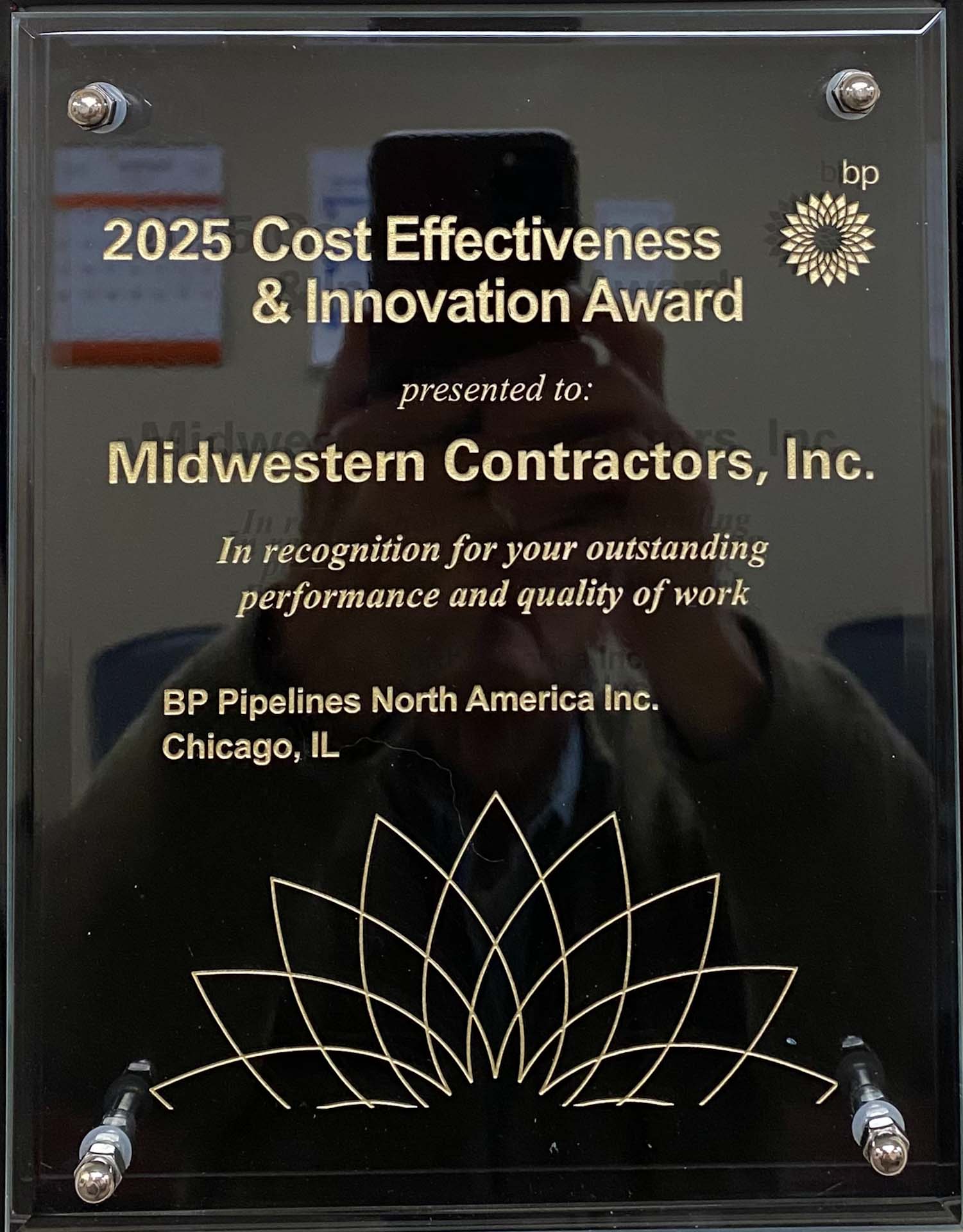 As a bonus Midwestern Contractors (MWC) was honored to receive BP’s Cost and Innovation award for work on a large pipeline relocation project. The company was impressed with how MWC was able to shorten the time required for permits as well as thoroughness of onboarding new hires and the robust security system set up to control access to the project site.